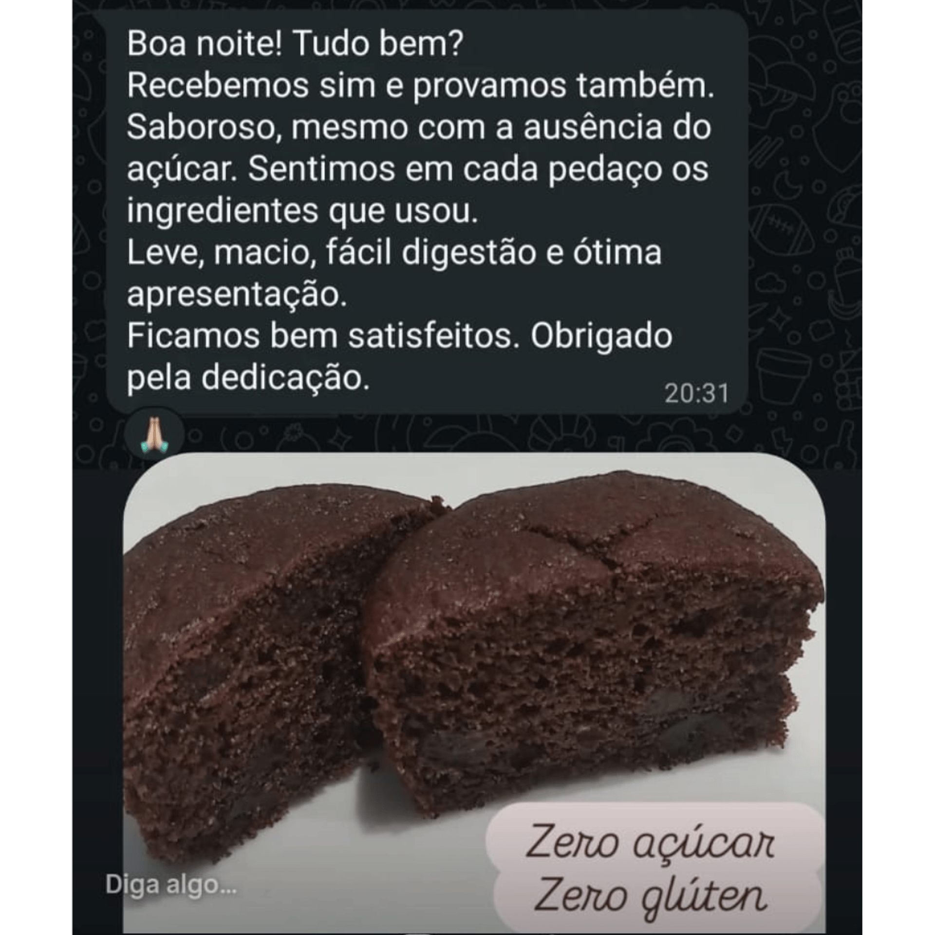 Feito com farinha de aveia, é super leve, com intenso sabor de chocolate, sem adição de açúcar refinado e pode ser congelado por um longo tempo sem perder as características.