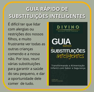 Um Guia de substituições Inteligentes, que eu vendo aqui por 30 reais. E um Manual para envolver as crianças no preparo dos alimentos, para te ajudar a tirar seu filho das telas e criar memórias afetivas com ele. Esse eu vendo por 25 reais.